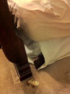 | Heck, he's even against a new bed. Even after this happened last night. There wasn't even any hanky panky going down. I swear. |